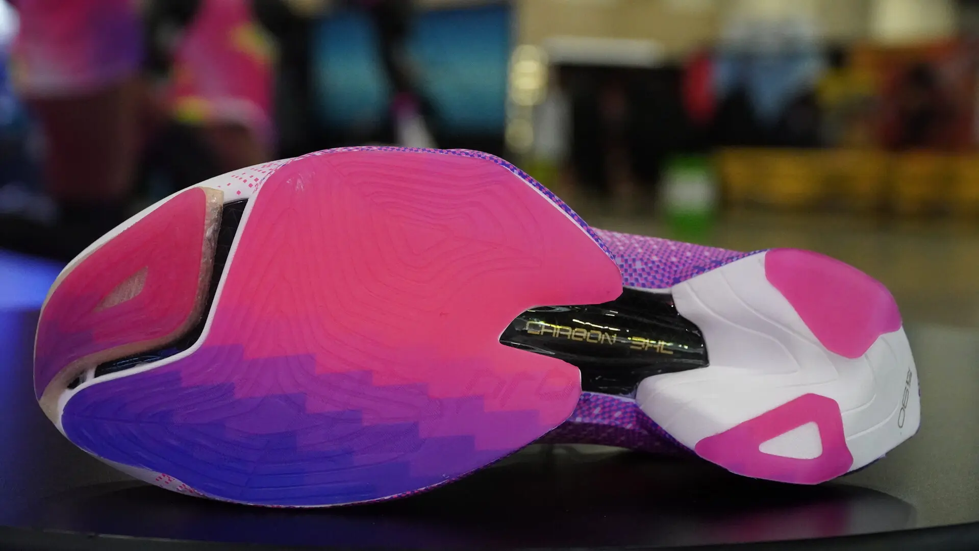 Углеродная пластина называется «Carbon 3HL», внимание привлекает её увеличение толщины в центральной части, где проявлялись рельефные элементы, но прежде всего — её жёсткость. Этот пенополиуретан называется Nitrogen 90%, и у нас нет никаких данных о его материалах и типах пены. Этот пенополиуретан Nitrogen 90% используется компанией Anta только в этой модели, поскольку в других скоростных моделях бренда применяется другой пенополиуретан под названием Nitrogen 85%+. В передней части подошвы, прямо у носка, более твердый материал (это не пена), которая, по-видимому, не только облегчает отталкивание благодаря своей твердости и изогнутой форме, но и стабилизирует стопу в этой конкретной части обуви.