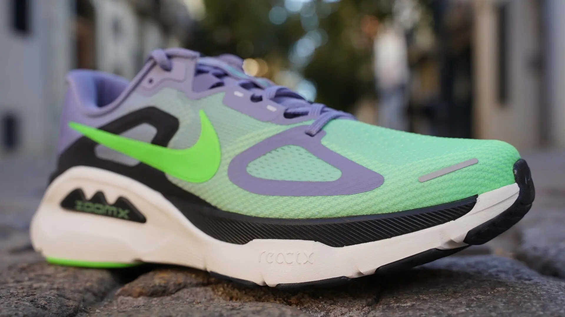 Nike выбрала двухслойную конструкцию из пеноматериала, сочетающую ReactX в нижней части — белую пену, которая обеспечивает жесткость, устойчивость и более широкую основу для контроля пронации, — с ZoomX в верхней части, видимой в черном цвете, которая добавляет дополнительную отзывчивость и комфорт при ходьбе.