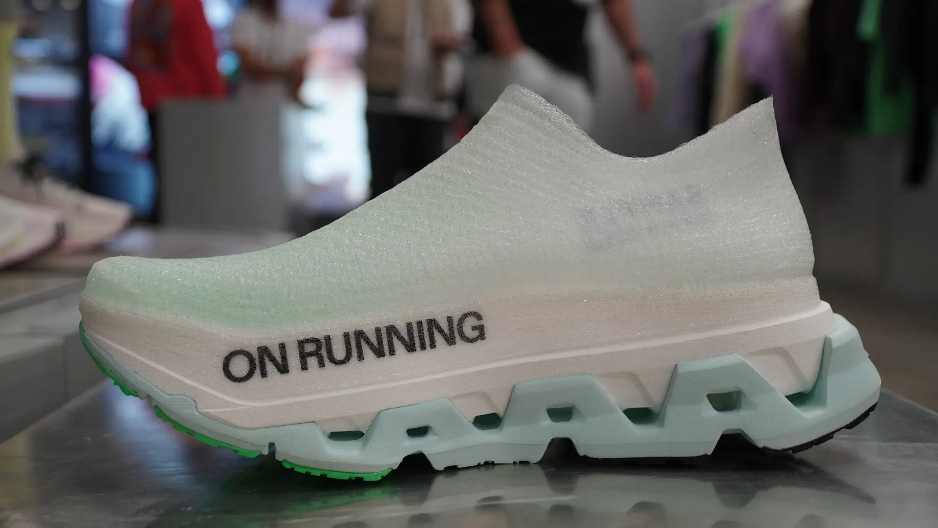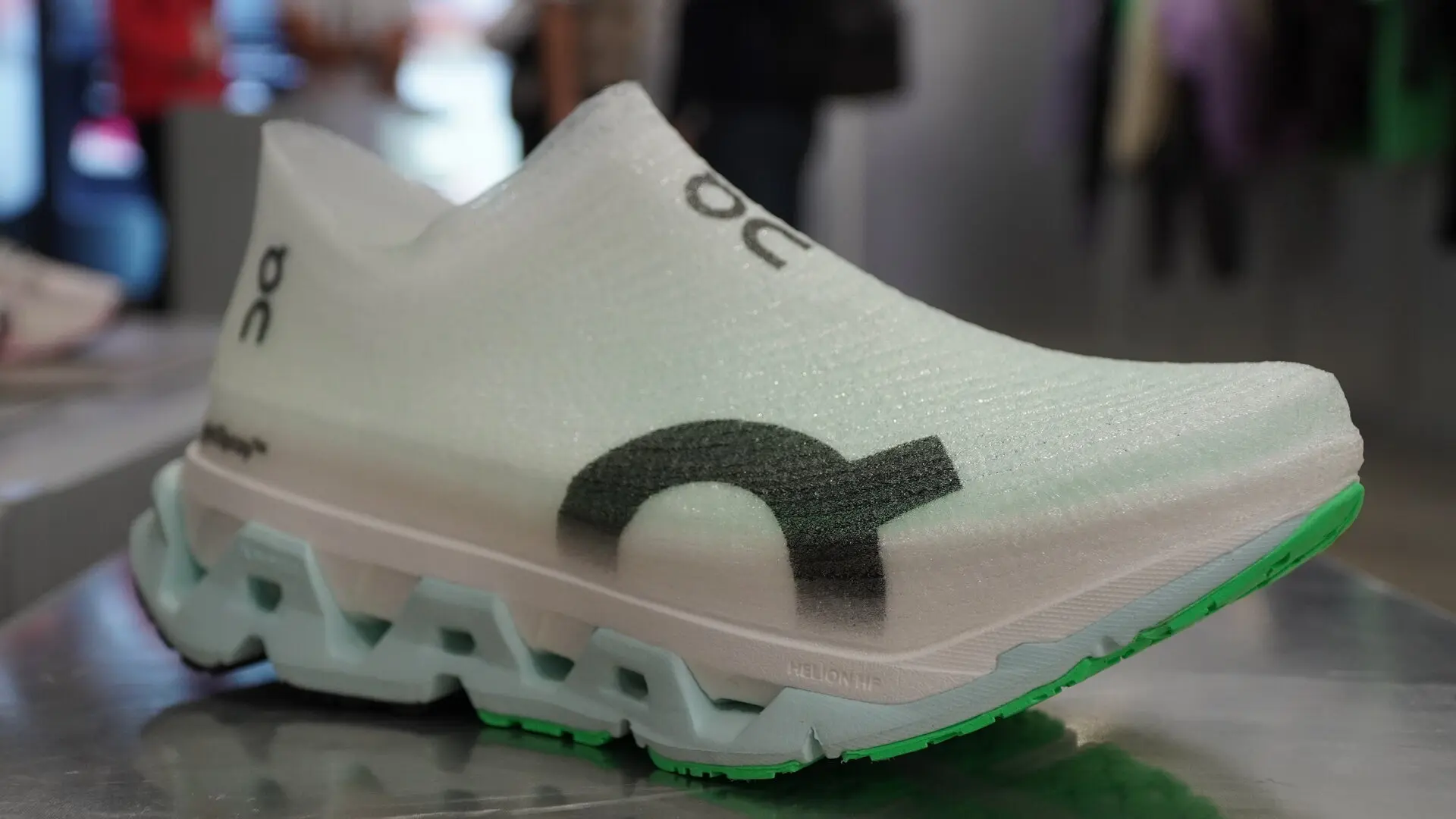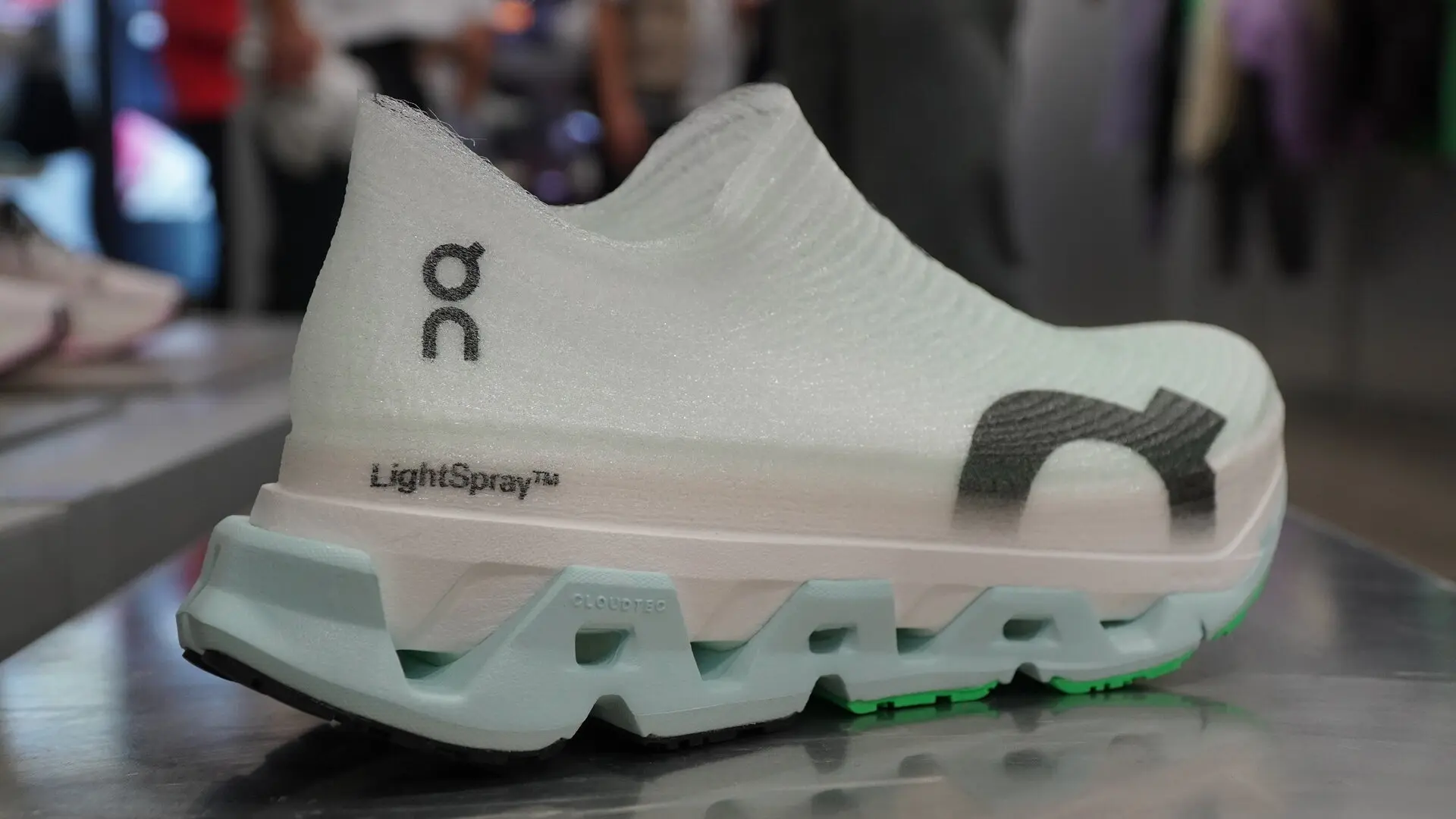 Напоминаем, что технология LightSpray — это система отделки верха обуви. Впервые её можно было увидеть на одной из их гоночных моделей (On Cloudboom Strike LS), а теперь видим LightSpray на одной из тренировочных моделей. Особенность этого материала — процесс его производства: швейцарский бренд работает с ним в своих лабораториях, используя роботов, которые вращаются вокруг обуви и «наносят» это уникальное покрытие. Примерно за минуту обувь готова, и её можно надеть — поистине уникальная конструкция. Процесс действительно впечатляет.